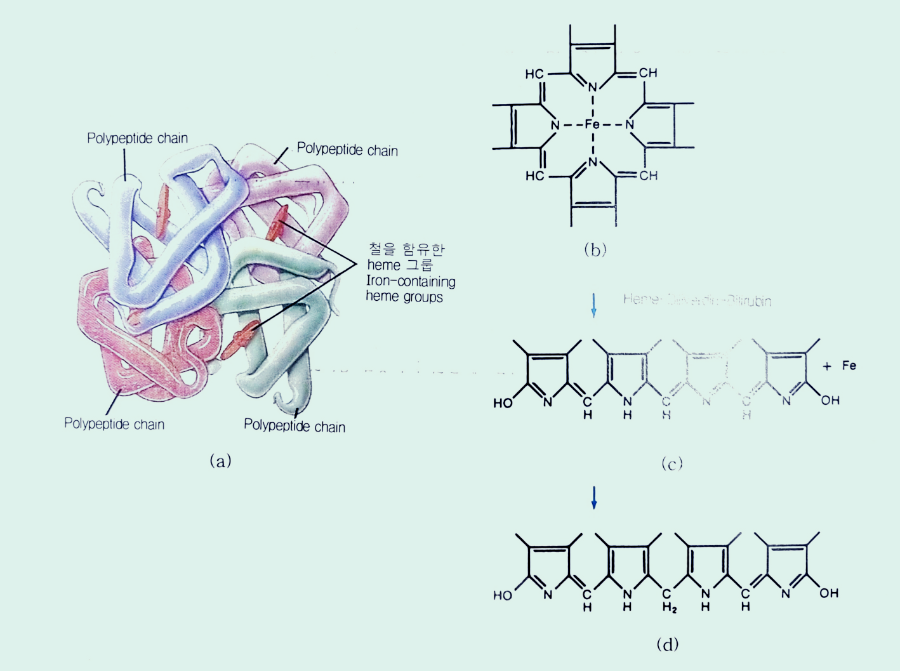 - 적혈구로부터 hemoglobin은 heme과 globin으로 분해된다.