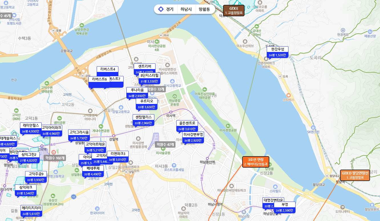 2. 현재 안양시 동안구 신축과 유사한 평단가를 보이고 있다. 하남시 대비 안양은 주요 업무지구와 물리적으로 가깝고, 4호선과 다양한 서울버스로 출퇴근이 수월하다. 학군역시 안양시 동안구가 압도적으로 우위를 차지하고 있다. 그럼에도 불구하고, 균질성있는 신축 환경과 교통 호재가 사람들의 수요를 끌어들일지 궁금해진다.