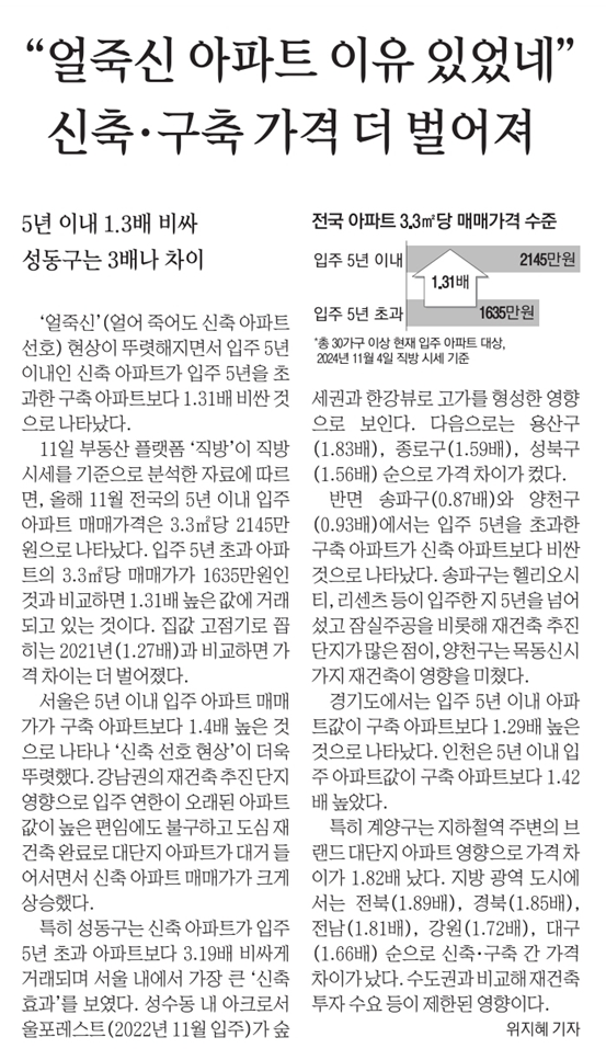 "얼죽신 아파트 이유 있었네" 신축, 구축 가격 더 벌어져