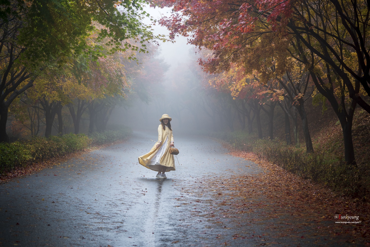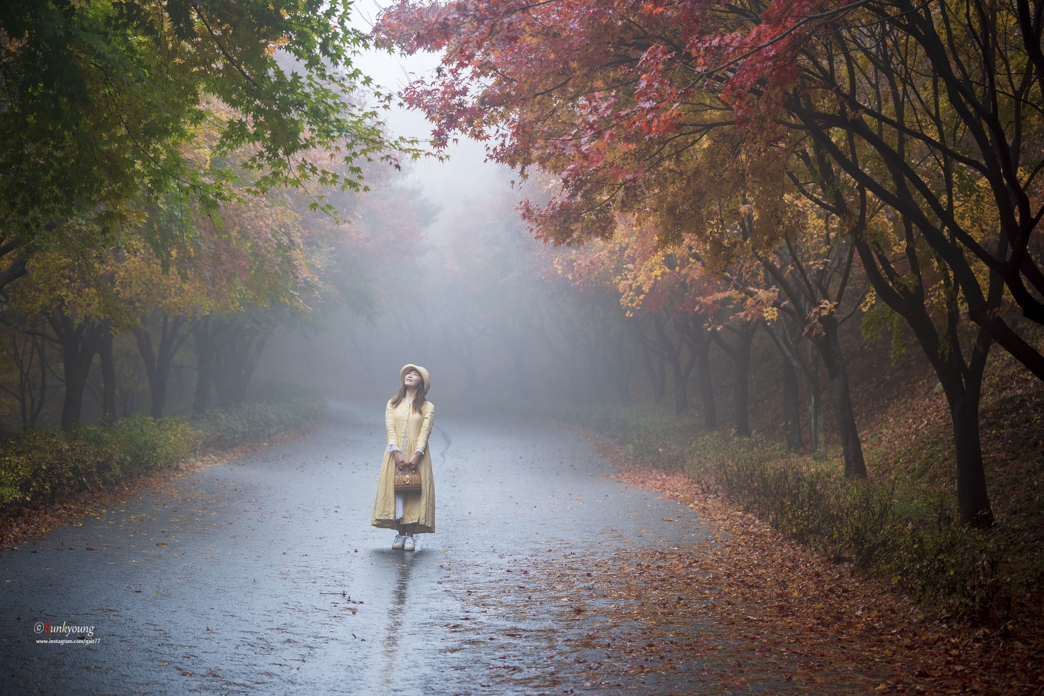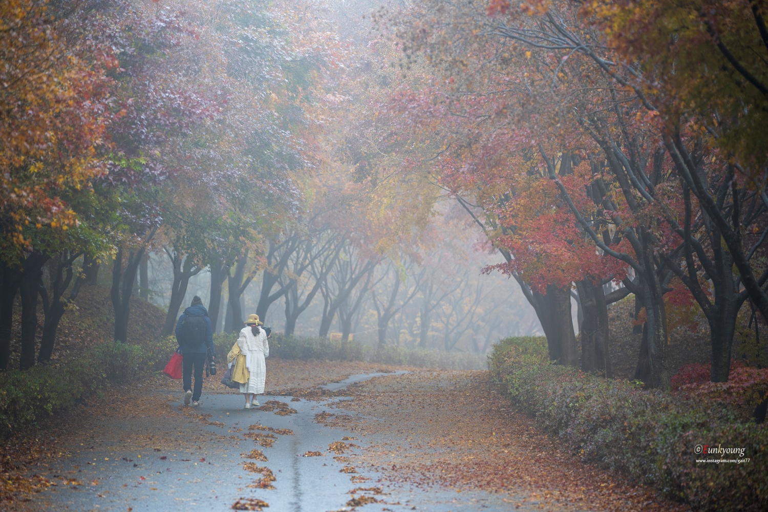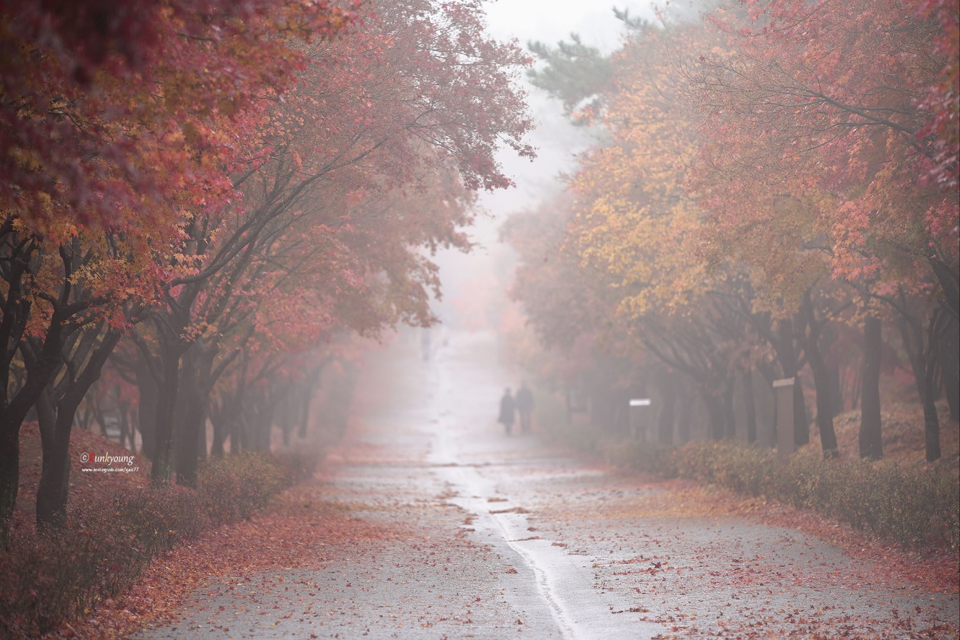 이른 새벽, 부슬비가 내리는 독립기념관의 단풍나무숲길. 비소식이 없었던 날이었는데... 빛을 볼 수 없다는 생각에 잠시 좌절모드에 빠져있던 그 순간. 자욱한 안개가 몽환적인 그림을 그려주던 아침이었습니다.